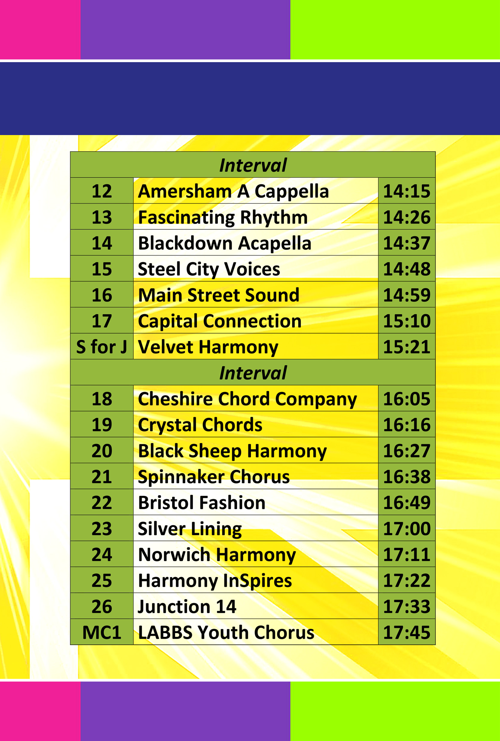 | 17:45 - 18:05 | Mic coolers- LABBS youth chorus followed by the presentation of Katy Phillips Young Barbershopper of the Year Award | ||