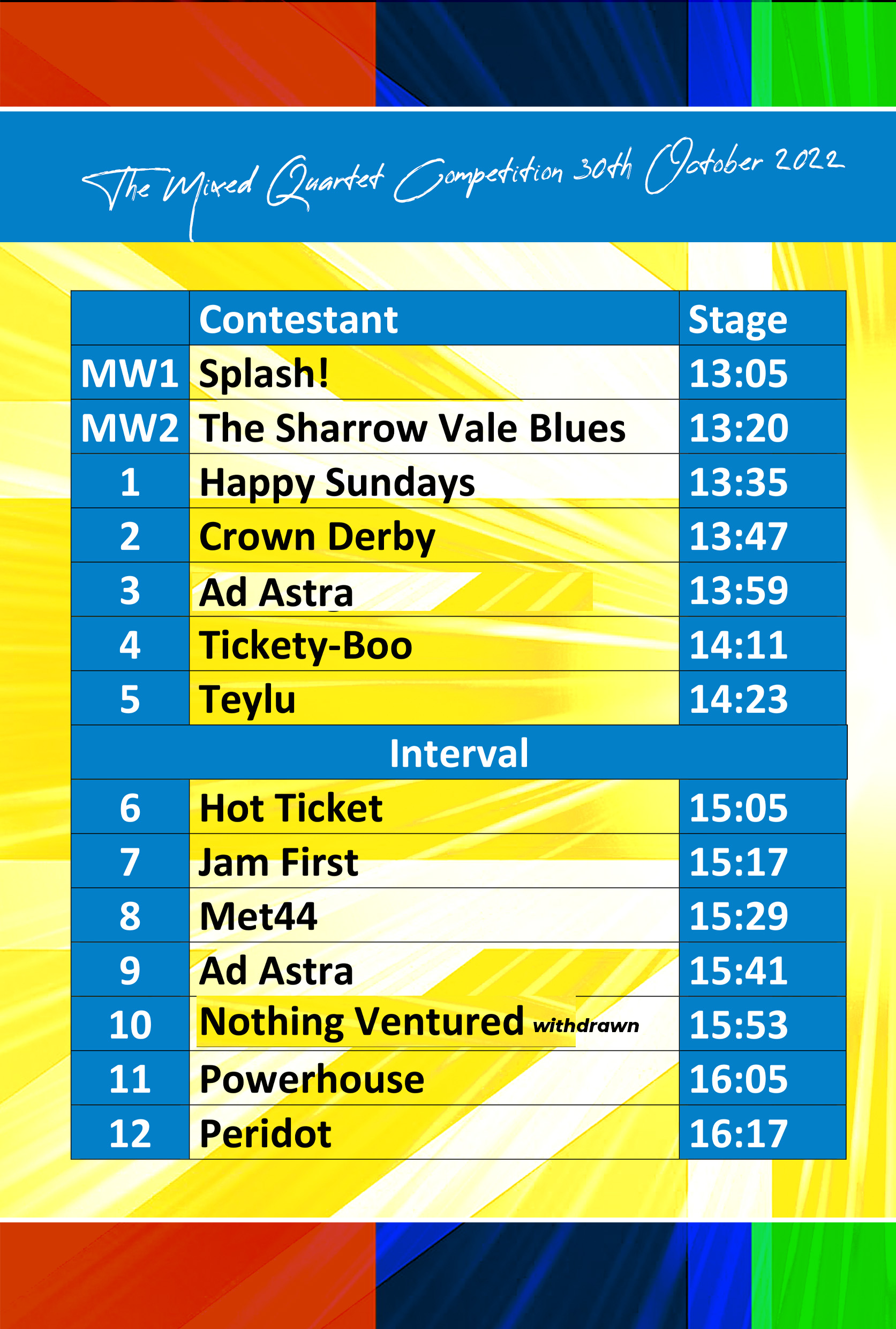 | 12:50 - 13:00 | Barbershop In Harmony (BinH) Mixed Quartet Contest Opening | |
