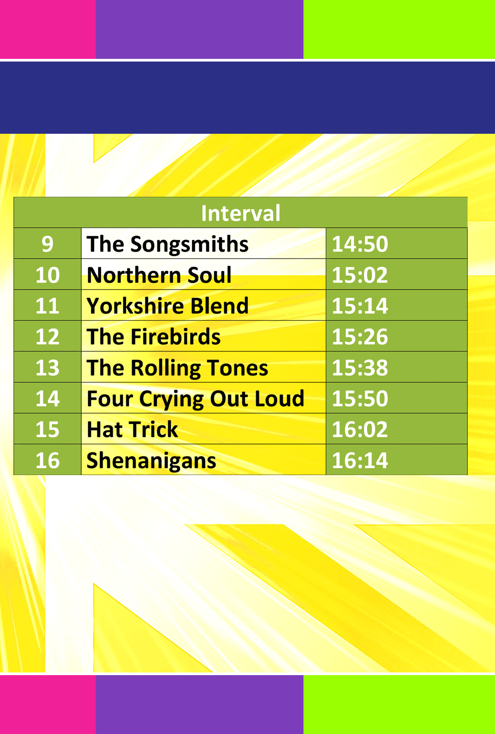 | 18:10 - 18:30 | Mass Sing led by Debi Cox- You Gotta Be. If I Can Dream. Bohemian Rhapsody. Lazy Day | Marketplace and Reception Closes for Results | |